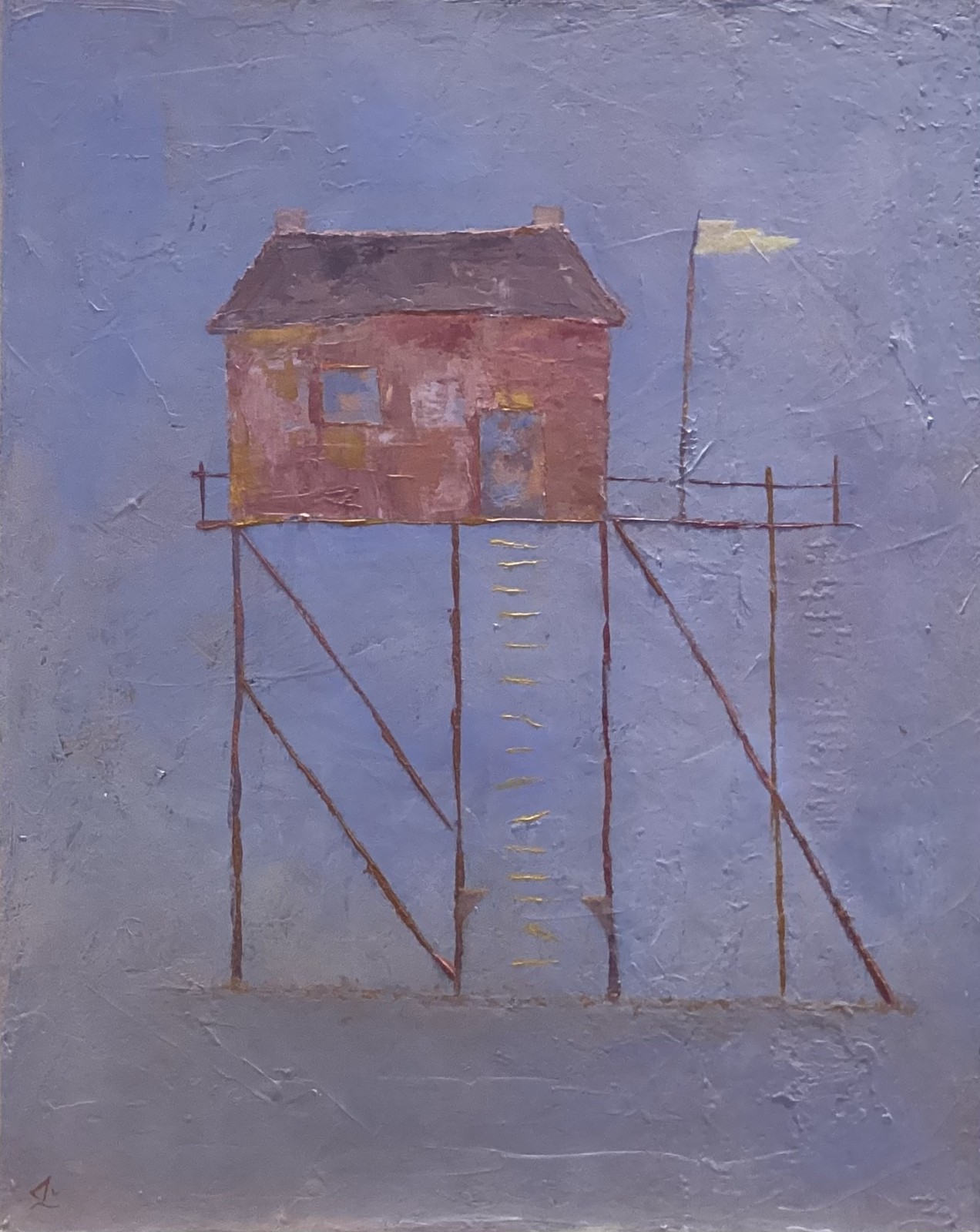 Mijn expositie bestaat uit schilderijen van huizen, in de waak-, slaap- of droomstand. Een huis staat symbool voor veiligheid, beschutting, comfort. Muren en een dak om je te beschermen tegen...? In deze tijd vol crisis en wanhoop hebben we behoefte aan bescherming, voor onszelf en voor anderen. Is dat haalbaar?